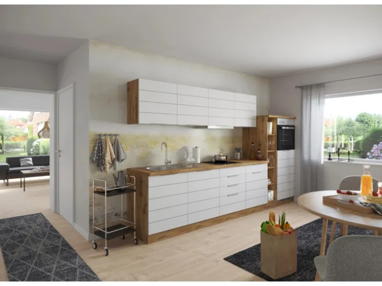 Die Küchenserie FLORENZ besticht durch ihre 2 absolut trendstarken Dekorkombinationen, in denen immer das ausdrucksstarke Wotan-Eichedekor eine entscheidende Rolle spielt. Elegante Metall-Griffleisten an hochwertigen MDF-Fronten mit Lisene in Mattweiß und Mattgrau werden mit einem ausdrucksstarken Eichedekor beim Korpus und der Arbeitsplatte kombiniert. So entsteht eine herausragende Optik, die genau den aktuellen Trend widerspiegelt. Eine Vielzahl an vordefinierten Zeilen und Winkel und verschiedenste Ergänzungsmöbel lassen keine Wünsche offen. In den Auszügen und hinter den Türen wird reichlich Stauraum für Küchenutensilien, Kochgeschirr und mehr geboten. Als Montagehilfe sind die einzelnen Schränke mit höhenverstellbaren Ausgleichsfüßen ausgestattet. Bestimmt werden Sie hier Ihre perfekte Küche finden!