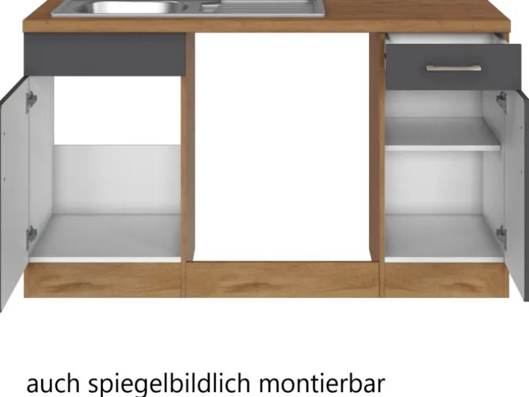 Die Küchenzeile wird Ihnen zerlegt und ohne Dekoration bis Bordsteinkante geliefert. Die Anordnung der Küchenelemente und die Anschläge der Türen sind somit für Sie frei wählbar. Die Arbeitsplatte wird ohne Ausschnitte geliefert. Technische Änderungen und Irrtümer vorbehalten
