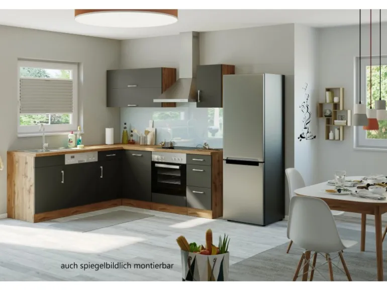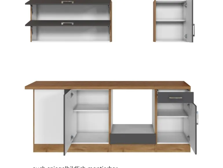 Die Küchenzeile wird Ihnen zerlegt und ohne Dekoration bis Bordsteinkante geliefert. Die Anordnung der Küchenelemente und die Anschläge der Türen sind somit für Sie frei wählbar. Die Arbeitsplatte wird ohne Ausschnitte geliefert. Technische Änderungen und Irrtümer vorbehalten