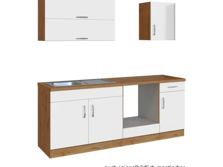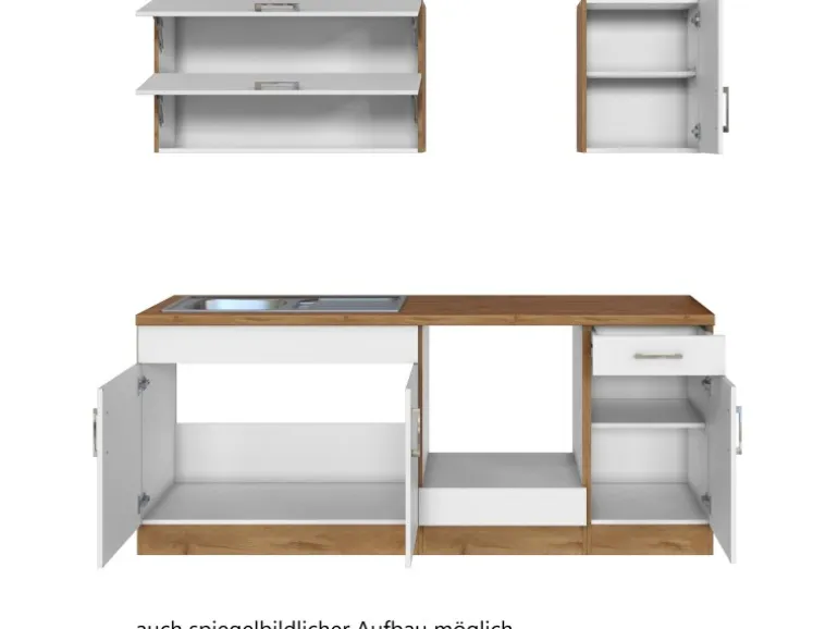 Die Küchenzeile wird Ihnen zerlegt und ohne Dekoration bis Bordsteinkante geliefert. Die Anordnung der Küchenelemente und die Anschläge der Türen sind somit für Sie frei wählbar. Die Arbeitsplatte wird ohne Ausschnitte geliefert. Technische Änderungen und Irrtümer vorbehalten