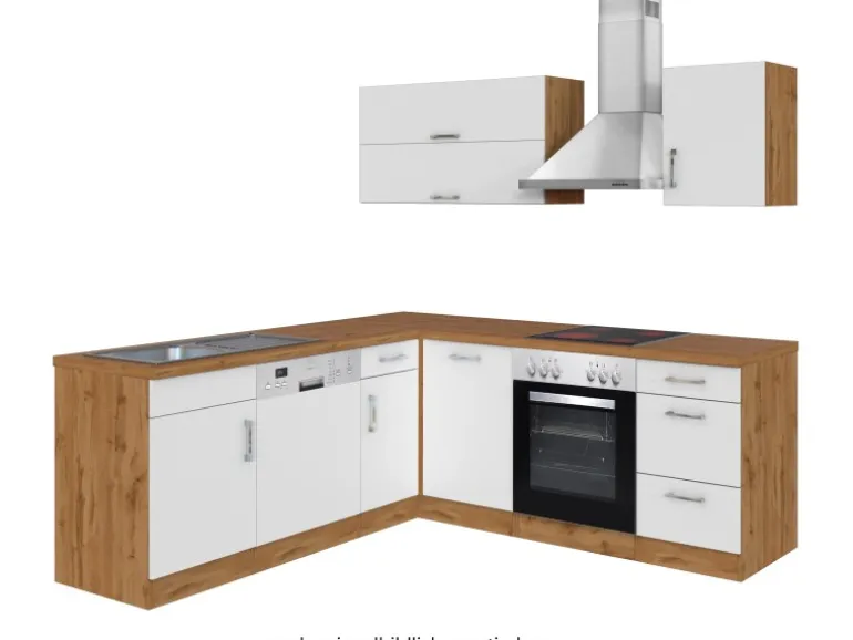 Die Küchenzeile wird Ihnen zerlegt und ohne Dekoration bis Bordsteinkante geliefert. Die Anordnung der Küchenelemente und die Anschläge der Türen sind somit für Sie frei wählbar. Die Arbeitsplatte wird ohne Ausschnitte geliefert. Technische Änderungen und Irrtümer vorbehalten