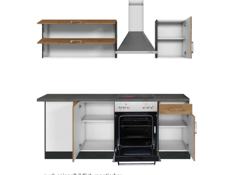 Die Küchenzeile wird Ihnen zerlegt und ohne Dekoration bis Bordsteinkante geliefert. Die Anordnung der Küchenelemente und die Anschläge der Türen sind somit für Sie frei wählbar. Die Arbeitsplatte wird ohne Ausschnitte geliefert. Technische Änderungen und Irrtümer vorbehalten