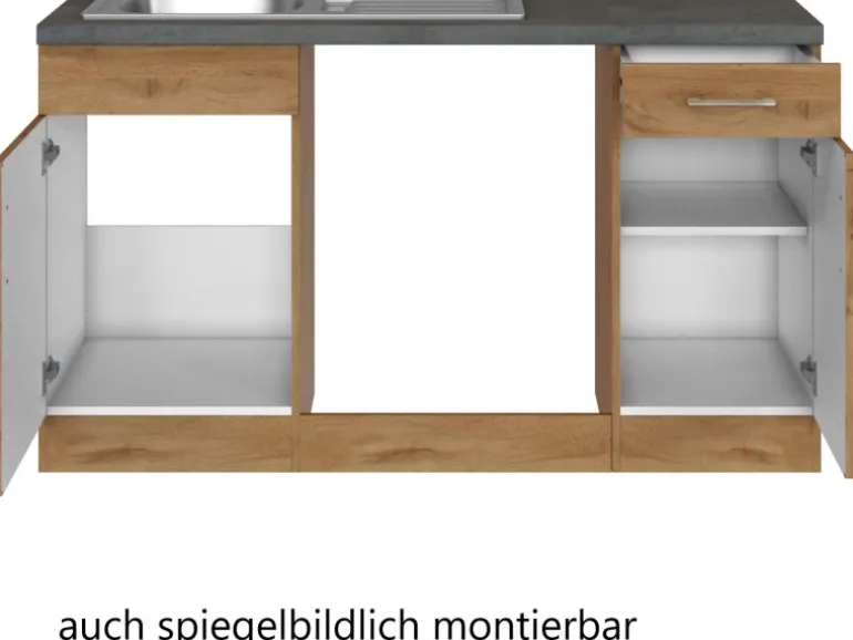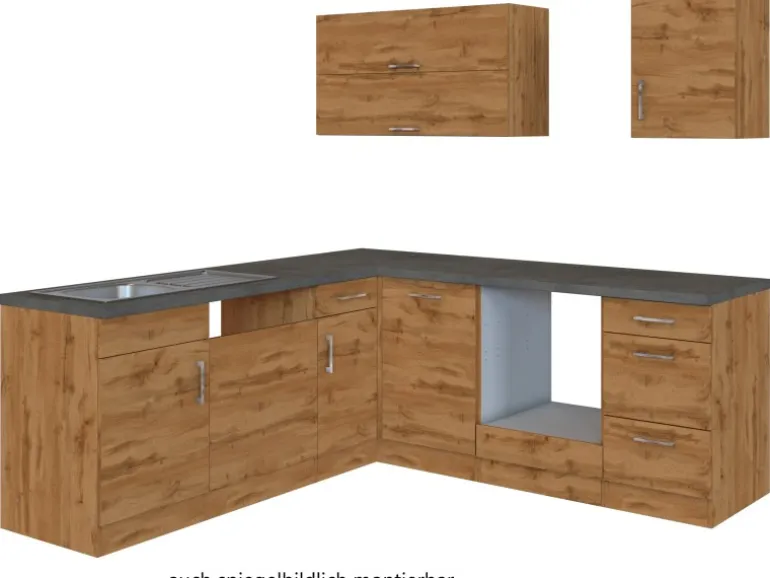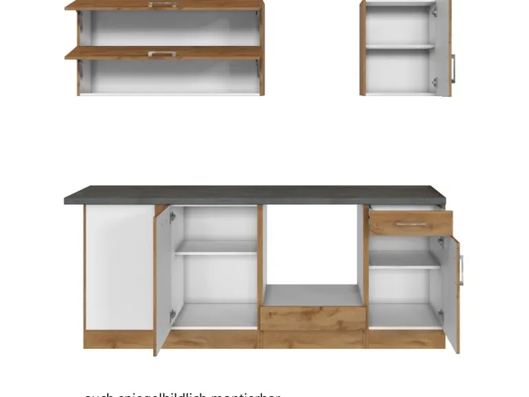 Die Küchenzeile wird Ihnen zerlegt und ohne Dekoration bis Bordsteinkante geliefert. Die Anordnung der Küchenelemente und die Anschläge der Türen sind somit für Sie frei wählbar. Die Arbeitsplatte wird ohne Ausschnitte geliefert. Technische Änderungen und Irrtümer vorbehalten