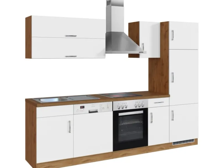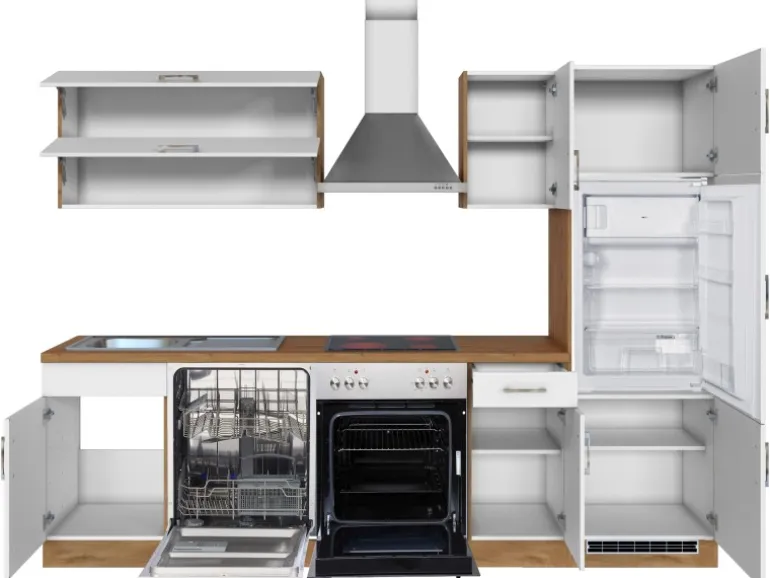 Die Küchenzeile wird Ihnen zerlegt und ohne Dekoration bis Bordsteinkante geliefert. Die Anordnung der Küchenelemente und die Anschläge der Türen sind somit für Sie frei wählbar. Die Arbeitsplatte wird ohne Ausschnitte geliefert. Technische Änderungen und Irrtümer vorbehalten