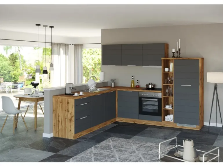 Die Küchenserie FLORENZ besticht durch ihre 2 absolut trendstarken Dekorkombinationen, in denen immer das ausdrucksstarke Wotan-Eichedekor eine entscheidende Rolle spielt. Elegante Metall-Griffleisten an hochwertigen MDF-Fronten mit Lisene in Mattweiß und Mattgrau werden mit einem ausdrucksstarken Eichedekor beim Korpus und der Arbeitsplatte kombiniert. So entsteht eine herausragende Optik, die genau den aktuellen Trend widerspiegelt. Eine Vielzahl an vordefinierten Zeilen und Winkel und verschiedenste Ergänzungsmöbel lassen keine Wünsche offen. In den Auszügen und hinter den Türen wird reichlich Stauraum für Küchenutensilien, Kochgeschirr und mehr geboten. Als Montagehilfe sind die einzelnen Schränke mit höhenverstellbaren Ausgleichsfüßen ausgestattet. Bestimmt werden Sie hier Ihre perfekte Küche finden!