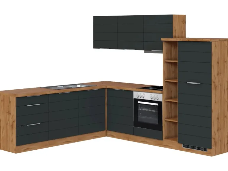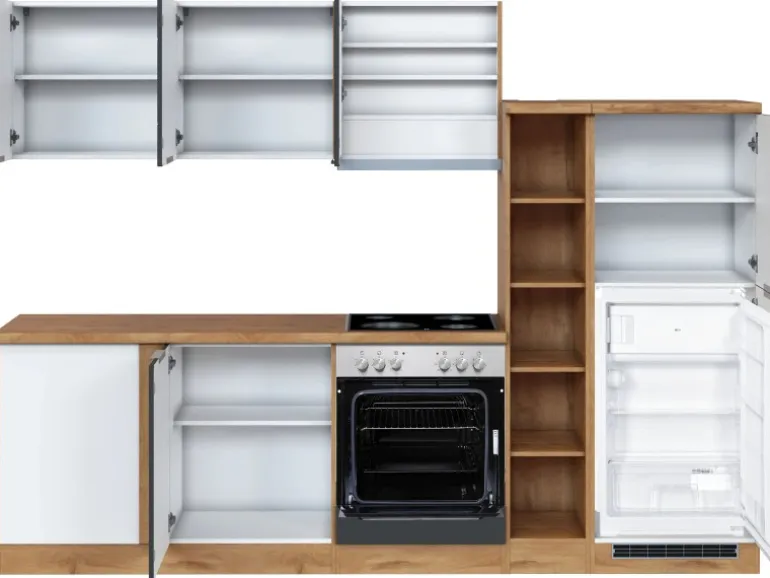 Die Küchenzeile wird Ihnen zerlegt und ohne Dekoration geliefert. Die Anordnung der Küchenelemente und die Anschläge der Türen sind somit für Sie frei wählbar. Die Arbeitsplatte wird ohne Ausschnitte geliefert. Technische Änderungen und Irrtümer vorbehalten
