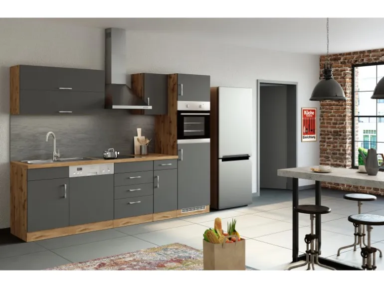 Die Küchenzeile wird Ihnen zerlegt und ohne Dekoration geliefert. Die Anordnung der Küchenelemente und die Anschläge der Türen sind somit für Sie frei wählbar. Die Arbeitsplatte wird ohne Ausschnitte geliefert. Technische Änderungen und Irrtümer vorbehalten