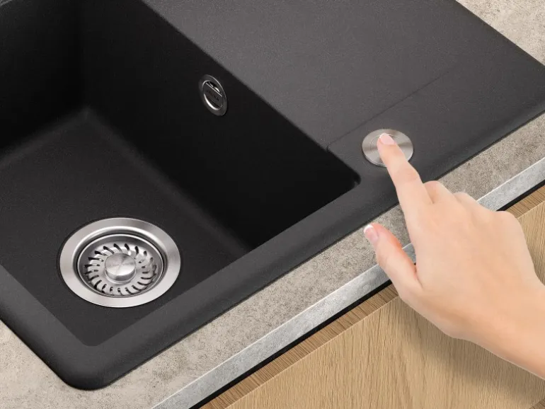 Das Wasser wird mit einem besonders modernen Push-Button-Ventil abgelassen, das sich einfach per Knopfdruck bedienen lässt. Das Spülbecken ist wendbar und kann sowohl auf der linken als auch auf der rechten Seite montiert werde.