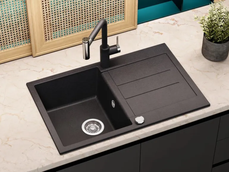 Helika Spülen werden aus natürlichem Quarzsand hergestellt, um einen hochwertigen Look und das Gefühl von echtem Stein zu bieten. Das Silicsana Granitmaterial besteht aus 80 % natürlichem Quarzsand und 20 % einzigartigem Kunstharz. Die Oberfläche der Spüle ist glatt und homogen, während die sanft abgerundeten Ecken eine einfache Reinigung ermöglichen.