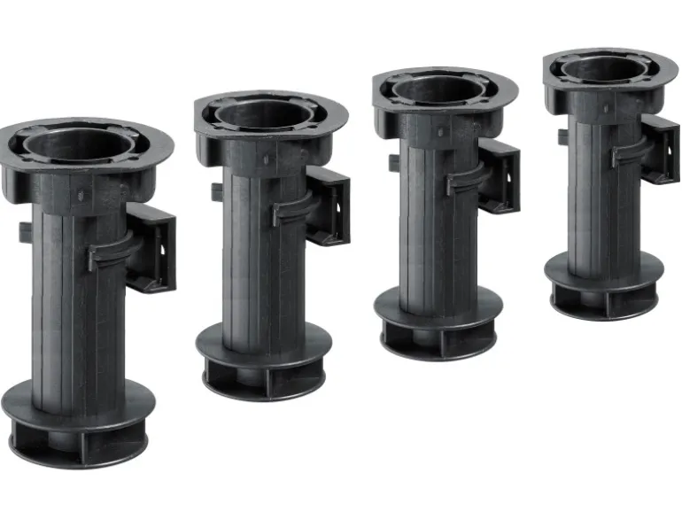 Set mit vier Kunststoff-Sockel-Verstellfüßen für Küchenunterschränke. Maximale Belastung von 200 kg und höhenverstellbar von 150 – 170 mm. Inkl. Klips zur Befestigung von Frontblenden.