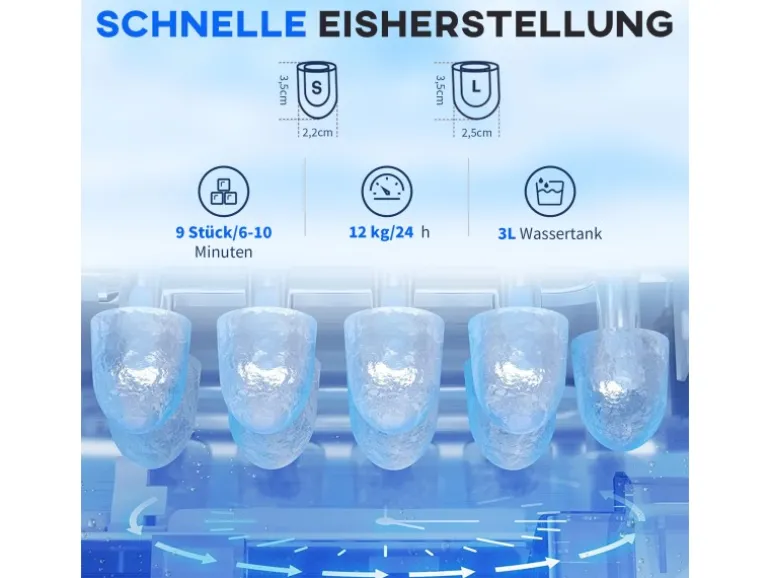 ● Produziert 12 kg Eiswürfel pro Tag: 9 Stück alle 6 bis 10 Minuten
