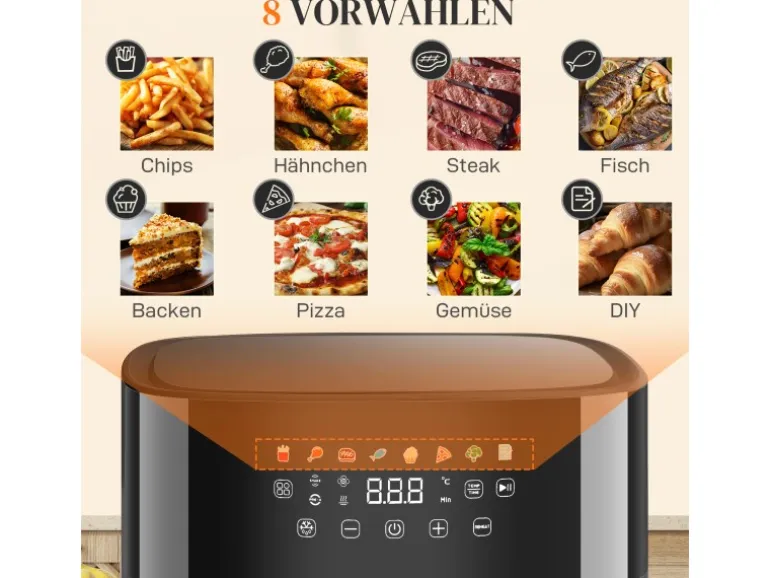 ● 8 voreingestellte Menüs der Heißluftfritteuse vereinfachen das Kochen verschiedener Gerichte