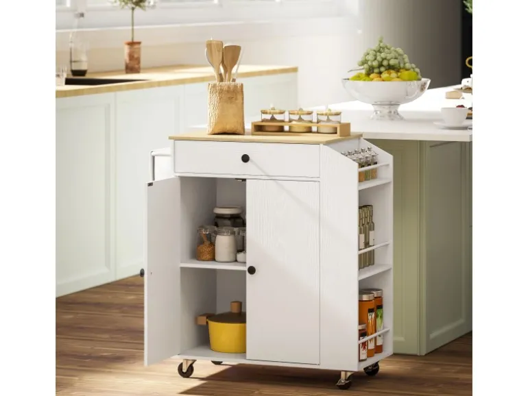 ● Eine Schublade zum Herausziehen und ein zweistufiger Schrank organisieren Küchenutensilien übersichtlich