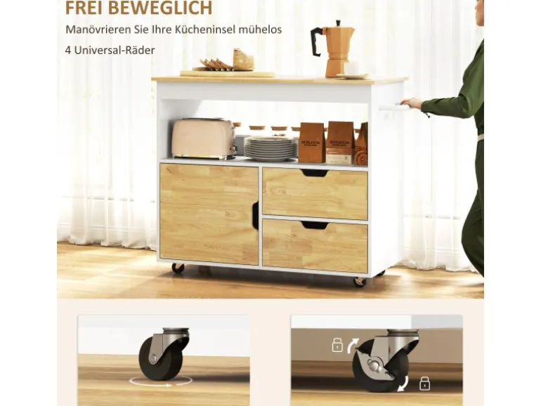 ● Zwei Schubladen und ein Einzeltür-Schrank des Wagens mit Rollen bieten Aufbewahrungsmöglichkeiten für Küchenutensilien