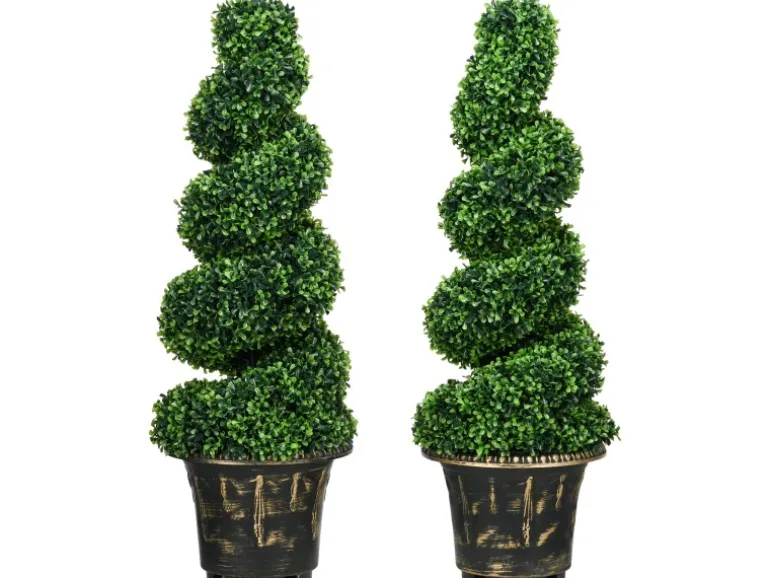 Verleihen Sie Ihrem Zuhause ganzjährig ein Hauch von Grün mit diesen zwei spiralförmigen Kunst-Buchsbäumen von Outsunny. Diese pflegeleichten Kunstpflanzen bleiben dauerhaft grün und benötigen weder Schnitt noch Pflege. Mit jeweils 1300 Blättern, die durch ihre realistische Farbe und Textur überzeugen, bieten sie eine täuschend echte Erscheinung. Die im Lieferumfang enthaltenen Töpfe sind mit Zement gefüllt, um eine kompromisslose Standfestigkeit zu gewährleisten. Ideal für jede Raumdekoration!