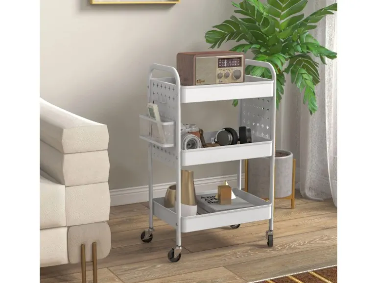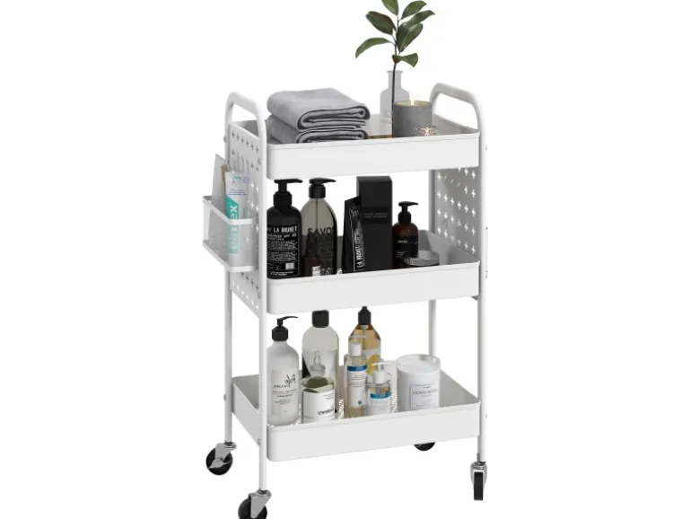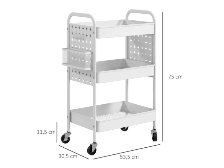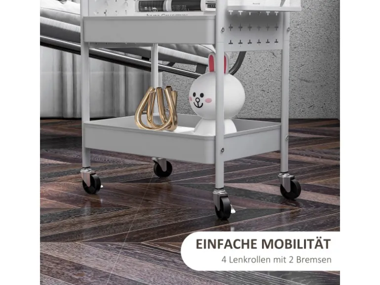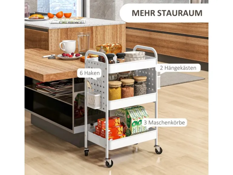 Dieser kompakte Rollwagen von HOMCOM ist ideal für kleine Räume, in denen mehr Stauraum benötigt wird. Die Gitterkörbe und die seitlichen Haken bieten viel Platz für verschiedene für Lebensmittel oder Zubehör. Ausgestattet mit leicht zu ziehenden Griffen für einen einfachen Transport. Vier leichtgängige Räder mit zwei Bremsen ermöglichen es Ihnen, den Nischenwagen zu bewegen, wo immer Sie ihn brauchen. Er kann als Badezimmerwagen, Servicewagen, Küchenwagen und Wäschewagen verwendet werden.