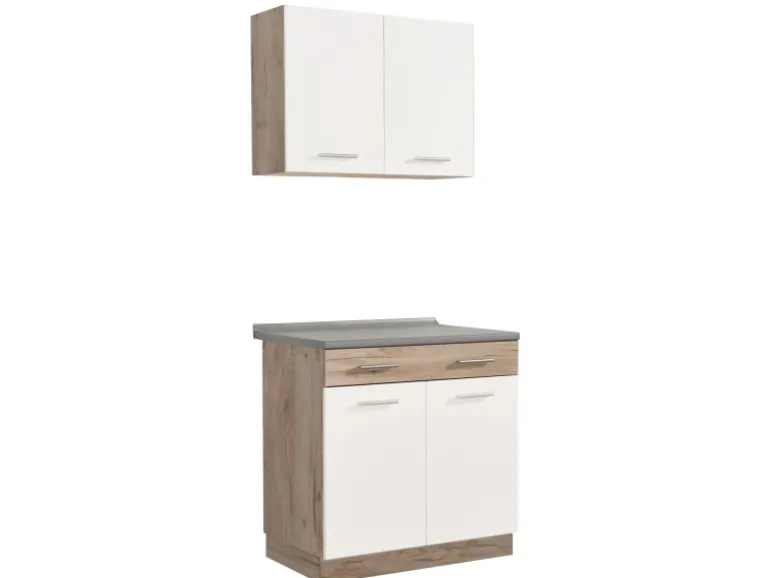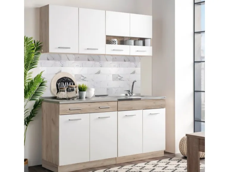Küchenregale mit Arbeitsplatte im modernen, hochwertigen Design in Weiß und Eichenholzoptik