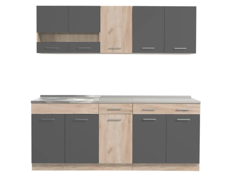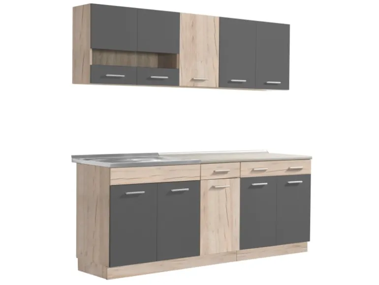 Die Einbauküche sorgt mit den Ober- und Unterschränken für viel Platz für Teller, Tassen, Gläser oder Töpfe. Die Schubladen bieten Stauraum für Besteck und weitere Kochutensilien. Der Küchenunterschrank wird mit einer robusten pflegeleichten Arbeitsplatte geliefert. Die Miniküche lässt sich durch zusätzliche Module aus unserem Sortiment erweitern.
