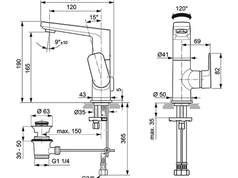 – Schwenkbereich: 90 °– Beiliegende Heißwassertemperaturbegrenzung