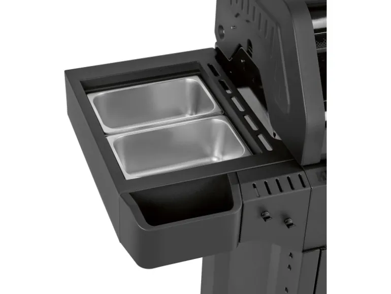 Die Seitentische dieses Jamestown Gasgrills sind wahre Multifunktionstalente. Sie bieten nicht nur einen gasbetriebenen Seitenbrenner, der sich ideal als zusätzliche Kochstelle für Beilagen oder Soßen eignet, sondern auch zwei integrierte Edelstahlbehälter. Nutze diese Behälter für die hygienische Aufbewahrung von mariniertem Fleisch, Gemüse oder Zubehör. Ein praktisches Bambus-Schneidebrett ist ebenfalls inklusive und macht die Vorbereitung direkt am Grill besonders komfortabel. Die Gesamtmaße des Grills betragen (H x B x T): 118 cm x 144 cm x 56 cm.