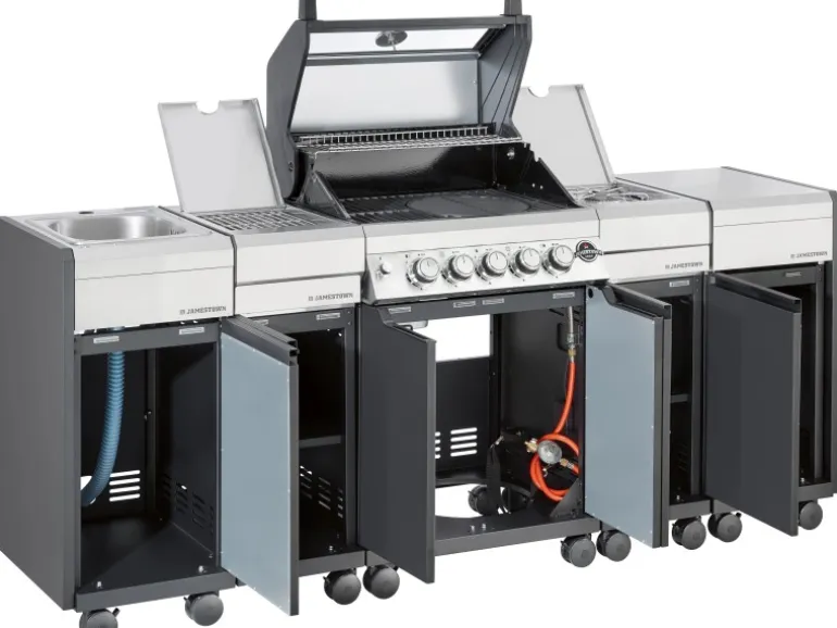 Nutze die verschiedenen Erweiterungsmodule (separat erhältlich) für deinen Jamestown Knox Gasgrill zur individuellen Zusammenstellung deiner persönlichen Outdoor-Küche. So kannst du deine Outdoor-Küche ganz nach deinen Wünschen gestalten und deinen Grillbedürfnissen anpassen.