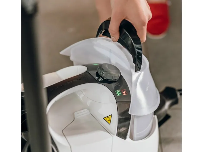 Der Kärcher Dampfreiniger SC 4 EasyFix verfügt über eine Zubehöraufbewahrung und eine Parkposition für die Bodendüse, damit du ihn zwischenzeitlich auch mal abstellen kannst. Darüber kannst du das Kabel im extra dafür vorgesehenen Kabelfach ordentlich verstauen. Das Bodentuch lässt sich dank des komfortablen Klettsystems an der Bodendüse befestigen und ohne Schmutzkontakt wechseln oder entfernen.