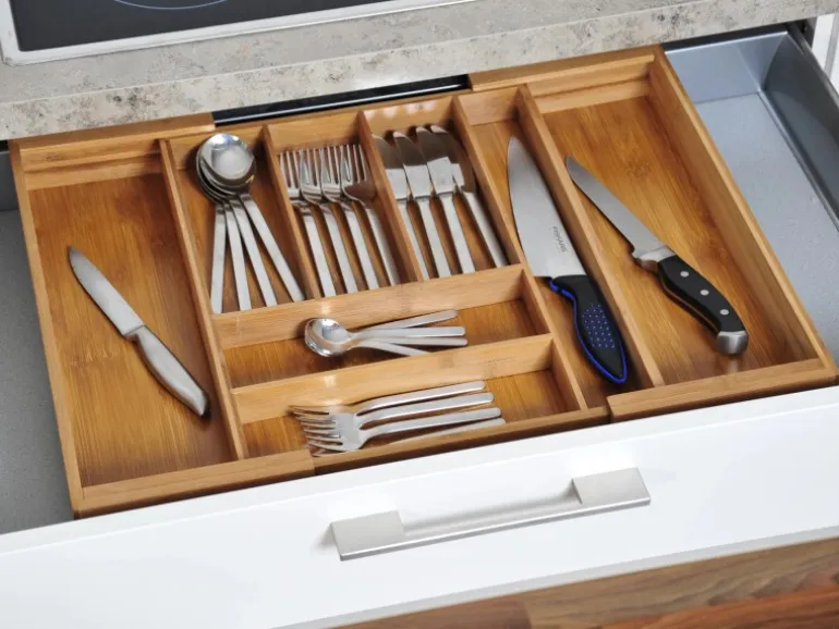 Auf diese Weise kann die Größe des Kesper Besteckkastens je nach Bedarf beliebig angepasst werden, sodass er problemlos in alle handelsüblichen Küchenschubladen passt.