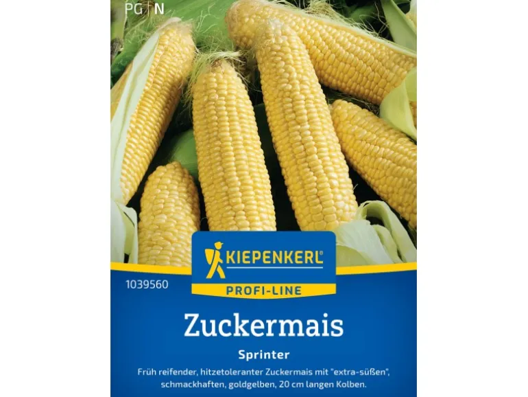 Der Kiepenkerl Zuckermais „Sprinter“ (Zea mays) ist eine ertragreiche Zuckermaissorte mit 20 cm langen, goldgelben, süßen Kolben. Diese Pflanze zeichnet sich durch Standfestigkeit und schlanken Kolben aus. Die Kolben sind erntereif, wenn die Narbenfäden braun werden und eintrocknen.