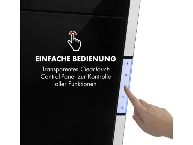 Jetzt kommt Glanz und Stimmung in die Küche – und ganz nebenbei beseitigt die Klarstein Mirage 90 Dunstabzugshaube auch Dampf und Essensgerüche. Die Mirage 90 Dunstabzugshaube macht kurzen Prozess mit Dunst und Brodel über der Kochstelle. Mit drei Leistungsstufen wird ihre Arbeitsleistung unkompliziert an das Kochgeschehen angepasst. Auf höchster Leistungsstufe befördert sie 550 m³/h Abluft aus der Küche und wird auch mit der Zubereitung mehrerer Gänge fertig. Dank modernster Technik halten sich dabei Geräuschaufkommen und Energieverbrauch im angenehm niedrigen Bereich mit gerade einmal 63 dB und Energieeffizienzklasse A++. Besonderen Reiz erlangt die Klarstein Mirage 90 Dunstabzugshaube nicht nur durch ihr edles, gläsernes Äußeres, sondern auch durch ihre zuschaltbare Ambiente-Beleuchtung mit neun unterschiedlichen RGB-Farben. So verleiht die kopffreie Wandabzugshaube jeder Küchenzeile ihre eigene Stimmung. Zusätzlich sorgen zwei weiße LED-Kochflächenlampen für einen jederzeit ungetrübten Blick in Pfannen und Töpfe. Besonderes Augenmerk verdient außerdem das ClearTouch Control-Panel, dass sich im rechten gläsernen Rand der Haube verbirgt und mit seinen transparenten Sensorfeldern fast unsichtbar die Funktionen der Haube dirigiert. Alles nötige Material zur Wandmontage sowie die passende Kaminverblendung sind im Lieferumfang enthalten. Mit Hilfe zweier Aktivkohlefilter (Artikel 10032843) kann die Haube auch vollkommen unkompliziert auf Umluftbetrieb umgerüstet werden. Edler Luxus für die Küche: Mit der Klarstein Mirage 90 Dunstabzugshaube erhalten Kochfelder einen stimmungsvollen Glanzpunkt und Küchen klare Luft.
