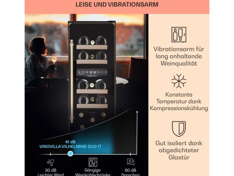 Edles Design und farbige Präsentation: Der Klarstein Vinovilla Victoria 17 Doppelzonen-Weinkühlschrank passt dank Slim-Design in nahezu jede Lücke! Neben der modernen Glastür überzeugt der Klarstein Vinovilla Victoria 17 Duo Weinkühler besonders durch seine zwei Kühlzonen. So kannst du Rot- und Weißweine zeitgleich bei unterschiedlichen Temperaturen kühlen und lagern. Dank der Glastür und der Innenbeleuchtung gelingt es dir, deine Weinbestände wundervoll in Szene zu setzen! Und dank seines stilvollen Vintage-Designs fügt er sich wundervoll in deine viktorianische Küche ein. Anspruchsvolle Weinlagerung: Der Doppelzonen-Weinkühlschrank Vinovilla Victoria 17 von Klarstein bietet einen stilvollen Platz und sorgt für ideale Trinktemperaturen! Der Weinkühlschrank 2 Zonen ist perfekt für Weinliebhaber, die ihre Sammlung optimal präsentieren möchten. Bestellen Sie noch heute den Klarstein Vinovilla Victoria 17 Duo Weinkühlschrank und haben Sie zu jedem Anlass den perfekt temperierten Wein zur Hand.