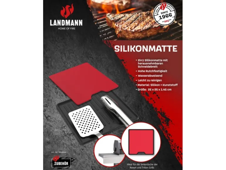 Hier haben wir das Landmann Silikonmatte mit Schneidbrett 25 cm. Hiermit kann man Vorbereitungen für das Grillen sauber und akkurat erledigen.