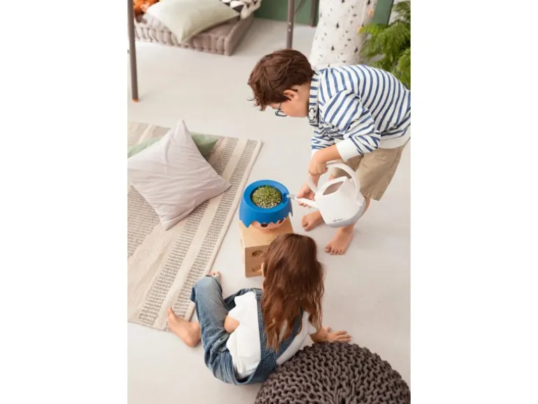Die Pflanzen werden einfach samt Kulturtopf ohne aufwändiges Umtopfen in die Ojo-Gefäße eingesetzt. Der von unten in den Kulturtopf gesteckte Bewässerungs-Stick transportiert gleichmäßig Feuchtigkeit zu den Wurzeln. Die großen, runden Augen zeigen an, wie viel Wasser sich im Reservoir befindet und lassen Kinder so das Wohl der Pflanze immer im Auge behalten. Werden die Interactive Eyes blau, ist das Wasserreservoir voll befüllt.