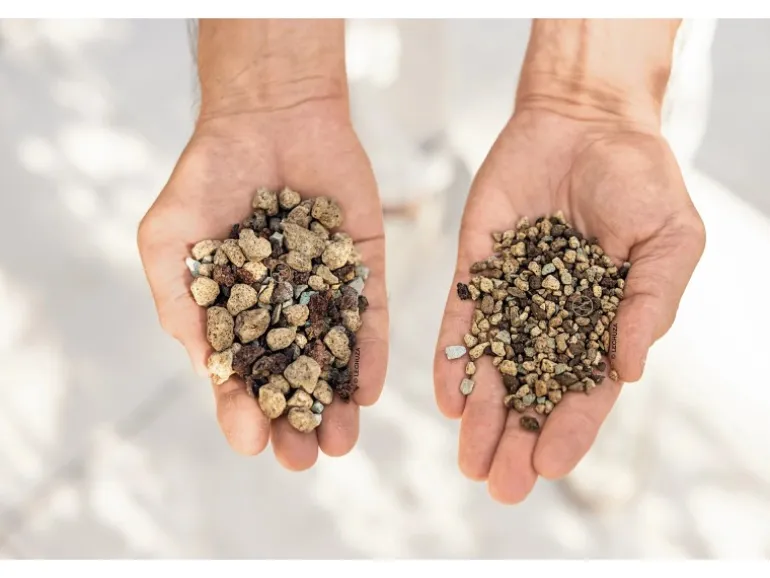 Gestein (Bims, Lava) und Zeolith in grober Körnung, Langzeitdünger (speziell für Zimmerpflanzen). Für den Einsatz essbarer Pflanzen geeignet.