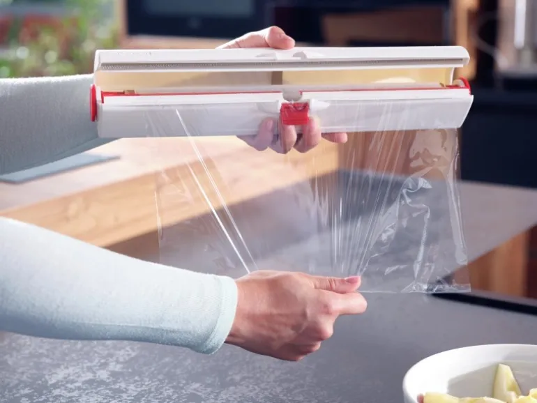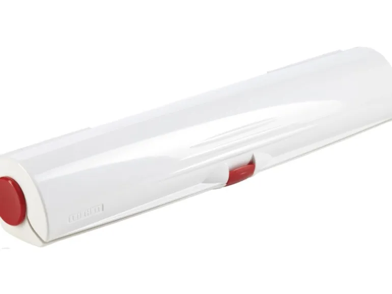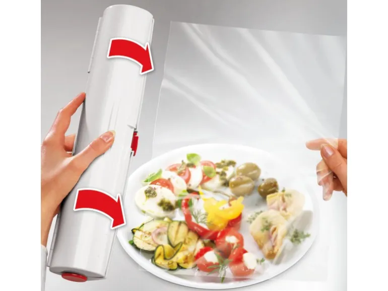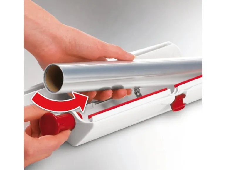 Mit dem Leifheit Folienschneider Perfect Cut ist Schluss mit verklebten und unsauber abgerissenen Folienenden. Der mobile Folienschneider schneidet Frischhaltefolien sauber und glatt ab – und zwar dort, wo die Folie gebraucht wird. Der einzige Folienschneider, der für die neue Breite der Frischhaltefolien von 33 cm geeignet ist, bietet perfekten Bedienkomfort: Einfach Folie auf die gewünschte Länge herausziehen, über den Teller oder die Schüssel halten und straff ziehen. Jetzt nur noch Deckel zudrücken und schon ist die gespannte Folie sauber abgetrennt – dank der speziell geschliffenen Schneidleiste im Inneren des handlichen Gehäuses. Das Auswechseln der Folienrolle geht ebenso schnell. Einfach über den komfortablen Mechanismus öffnen, Folie einlegen und schließen. Auch für Alufolie geeignet. Maximale Rollenbreite 33,5 cm.