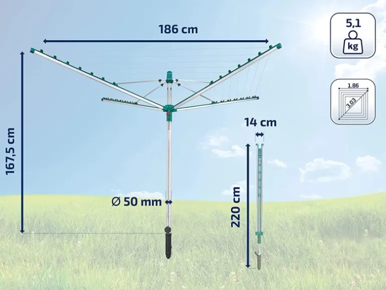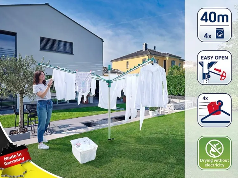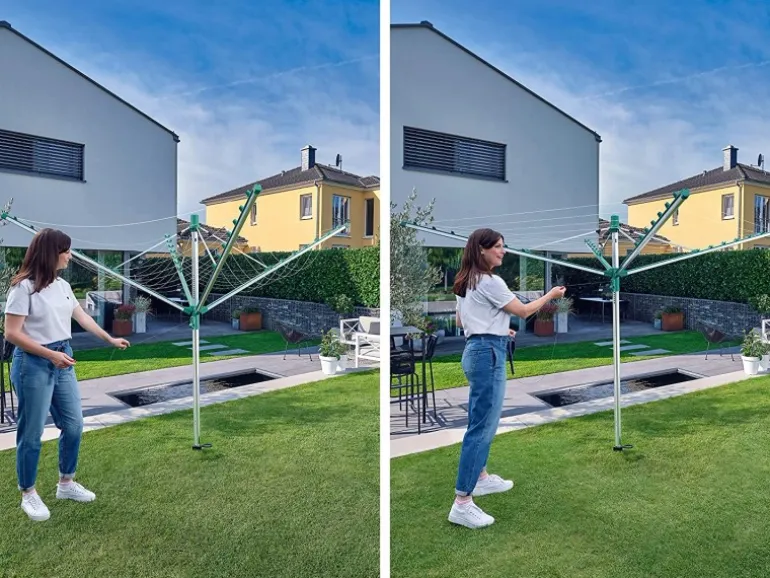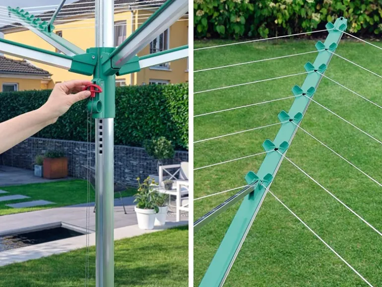 Die Wäschespinne Linomatic 400 Easy von Leifheit. Bis zu vier Waschmaschinenfüllungen können gleichzeitig an dem Wäscheschirm mit 40 m Leinenlänge von Leifheit aufgehängt werden. Selbst besonders große Wäschestücke wie Decken, Vorhänge oder BDettlaken finden problemlos an der Wäschespinne Platz, denn die maximale Leinenlänge beträgt 1,86 m. Mit ihrer Hilfe reduziert sich der Energieverbrauch im Haushalt. Zudem überzeugt das Modell mit kinderleichter Handhabung: Das Easy-Lift-System ermöglicht das einfache Öffnen. Um die Wäschespinne Linomatic 400 Easy wieder zu schließen, braucht lediglich die Entriegelung am Standrohr betätigt zu werden. Die Leinen werden dank des automatischen Leineneinzugs in die Tragarme gezogen. Dort sind die vor Nässe sowie Schmutz sicher und die Wäsche bleibt sauber. Damit der Wäscheschirm direkt aufgestellt werden kann, ist im Lieferumfang eine Bodenhülse zum Einbetonieren bereits enthalten.