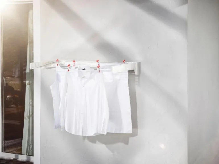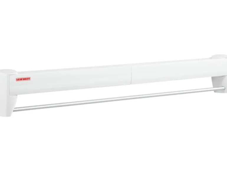 Der Wäscheaufhänger bietet eine perfekte Lösung für kleine Badezimmer und Balkons und steht bei Nichtgebrauch nicht im Weg herum. Der Wandtrockner lässt sich bei Bedarf einfach ausziehen und danach einfach wieder platzsparend zusammenschieben. Gleichzeitig sind die Trockenstäbe vor Schmutz und Regen geschützt.