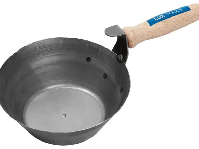 Die LUX-TOOLS Gipserpfanne ist zum Anrühren kleinerer Mengen Gips- oder Spachtelmasse geeignet, beispielsweise zum Verputzen von Steckdosen oder Bohrlöchern. Das konisch geformte Behältnis überzeugt Hobbyheimwerker durch seine solide Qualität. Es verfügt über einen praktischen Holzgriff und einen integrierten Einhängehaken für das Arbeiten an der Leiter. Das 310 mm hohe Gefäß besteht aus stabilem Carbonstahl, der durch seine rostfreien Eigenschaften überzeugt. Der Ø der Öffnung misst 170 mm, nach unten hin verjüngt sich die Pfanne auf 110 mm.