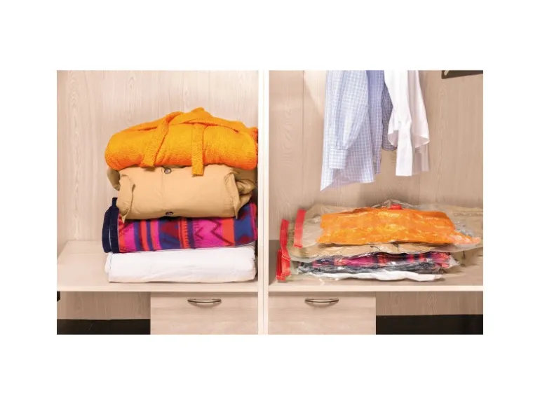 Die mehrschichtigen Materialien der Magic Vac Vakuumbeutel für Kleidung schützen den Inhalt vor Staub, Gerüchen, Feuchtigkeit und Motten. Dies ermöglicht eine sichere Lagerung und sofortige Verwendung der Kleidung beim Öffnen des Beutels.