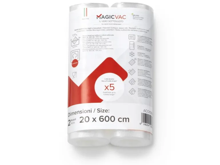 Die Magic Vac Vakuumierfolienrollen sind nicht nur für die Aufbewahrung von Lebensmitteln geeignet, sondern auch für das Kochen im Wasserbad oder Dampfofen. Sie sind BPA-frei und somit sicher im Kontakt mit Lebensmitteln. Außerdem sind sie wiederverwendbar und waschbar. Die patentierte Folie mit einer besonderen Dicke von 0,24 mm und einer speziellen Mehrschicht-Struktur bietet herausragenden Schutz und Haltbarkeit für empfindliche sowie spitze Inhalte.