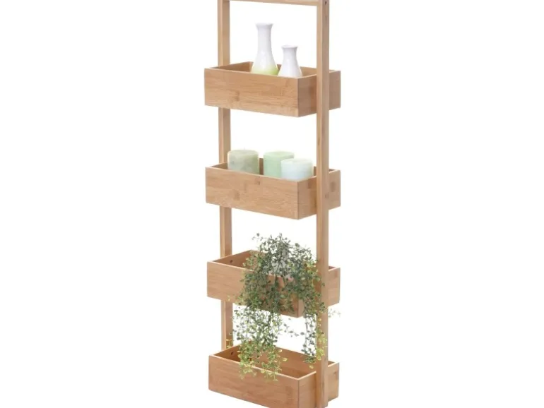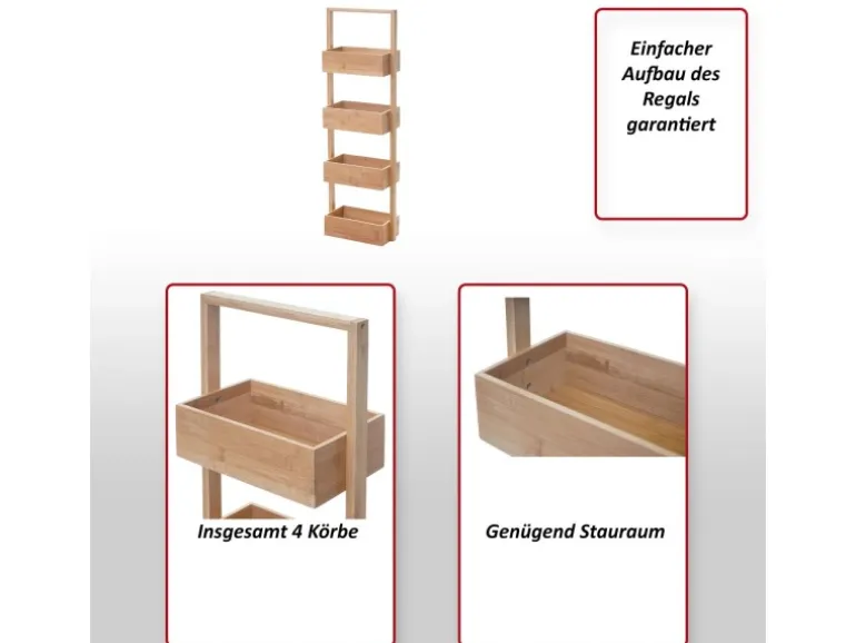 Dieses praktische Regal überzeugt durch viel Stauraum auf kleiner Fläche. Egal ob im Bad, Kinderzimmer, Flur oder Küche, es macht überall eine gute Figur und lässt Ordnung sprichwörtlich zum Kinderspiel werden. Durch die schlichte Schönheit des Bambus-Holzes und die Aufbewahrungskörbe fügt sich das Regal perfekt in jeden Raum ein und setzt trotzdem einen schönen Akzent in Ihr Zuhause. Der Aufbau ist denkbar einfach und so ist Ihr neues Möbelstück in kürzester Zeit einsatzbereit.