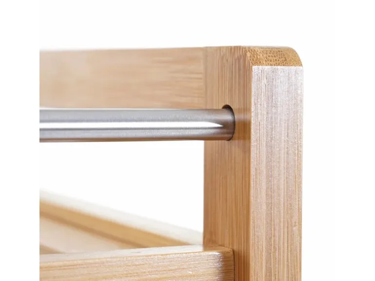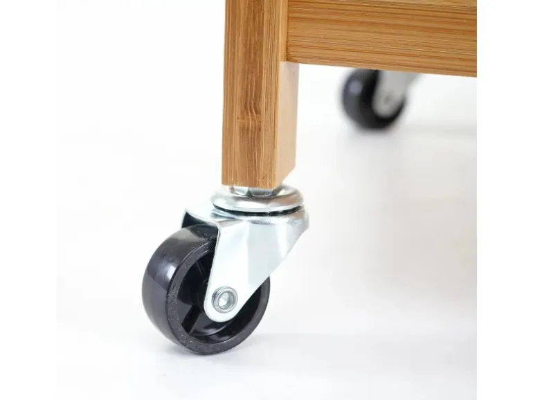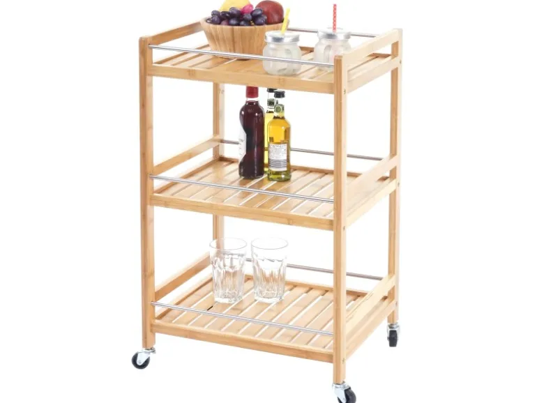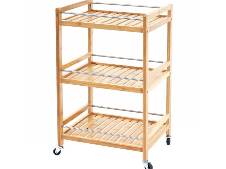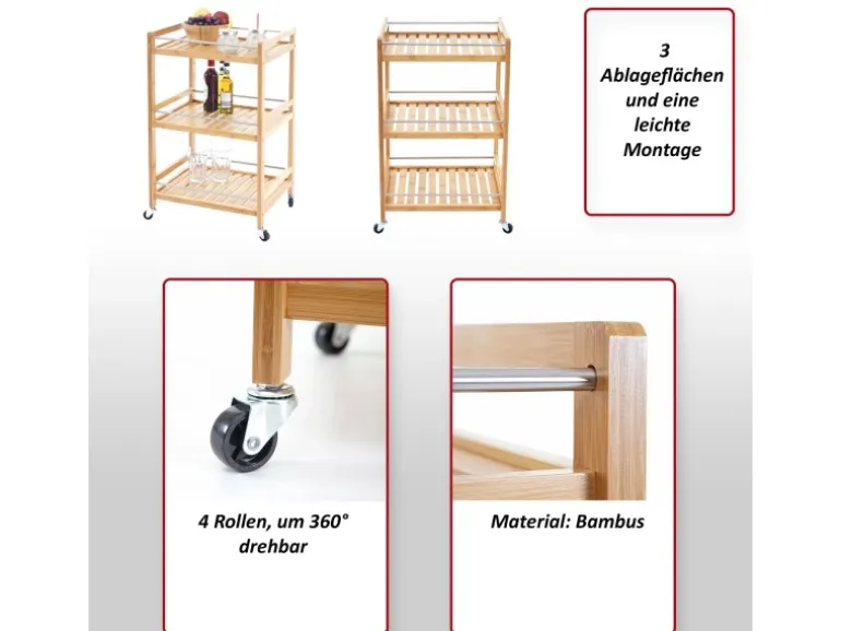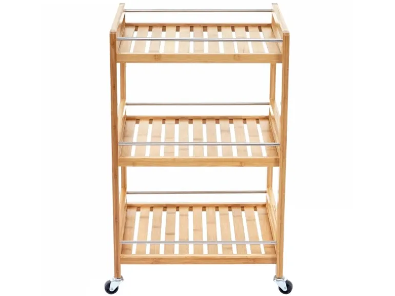 Dieser Rollwagen aus Bambus wird Ihnen ein vielseitig einsetzbarer Helfer im Haushalt sein: als Vorratsregal für Lebensmittel in der Küche, als Bar- oder Beistellwagen im Esszimmer für Geschirr und Flaschen oder als Ablagefläche in vielen anderen Räumen. Mit den vier um 360° drehbaren Rollen lässt sich der Beistellwagen leicht in jedem Raum verschieben und auch gut rangieren. Die drei Ablagen bieten viel Platz auf kleiner Grundfläche.