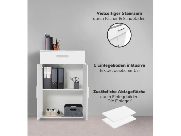 Das Produkt CLEVERER STAURAUM! Unser Schubladenschrank in 2 Größen vereint durch mehrere Fächer und Schubkasten Elemente aus Kommode & Nutzschrank miteinander, die dir viel Platz bieten. Individualisierbar mit weiteren Einlegeböden ‚Einleger‘ mit +4 Positionierungsmöglichkeiten. MADE IN GERMANY! Die Schränke werden aus Spanplatte mit beständiger Kunstharzbeschichtung & Kunststoffgriffen in NRW hergestellt. Durch die kompakten Maße dient der moderne Hoch- & Midischrank als Küchenschrank, Wäscheschrank, Büroschrank oder Allzweckschrank.
