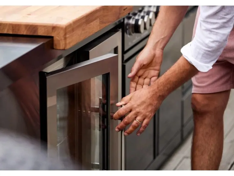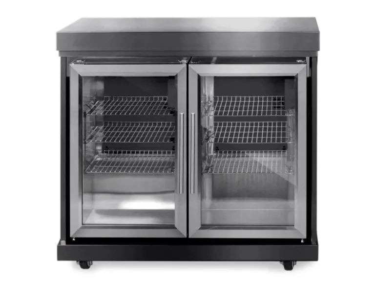 Freistehender zweitüriger Modul-Kühlschrank mit Anthrazit-Finish. Der Kühlschrank verfügt über Kompressorkühlung und bietet eine Kühlleistung von bis zu 3°C. Ideal für Ihre Outdoorküche!