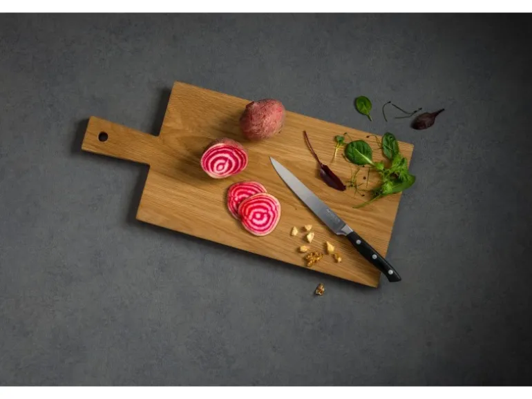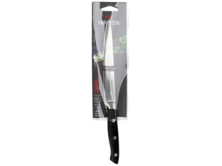 Das hochwertige Edelstahl-Universalmesser von Nirosta eignet sich für das Schneiden von Brötchen, Obst und Gemüse aller Art. Es überzeugt mit sehr guter Schneidleistung und langer Schnitthaltigkeit. Außerdem besitzt es einen präzisen Handabzug und einen dreifach genieteten Griff mit Fingerschutz.