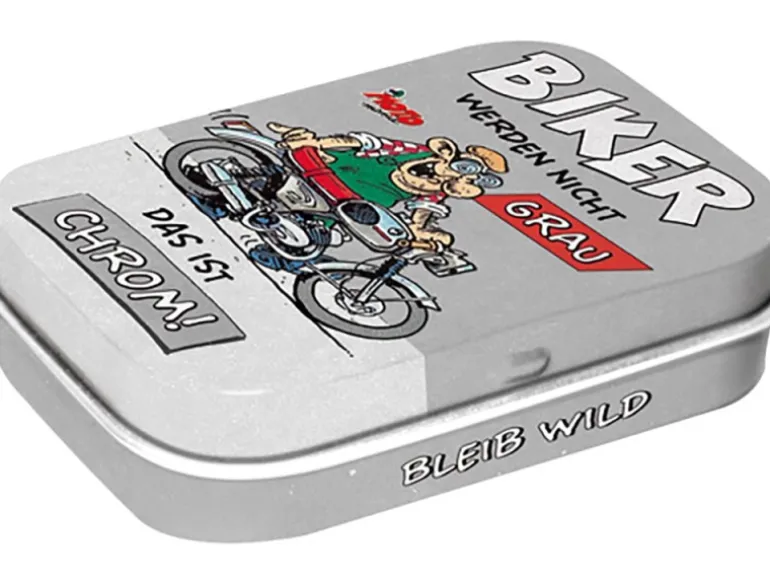 Wunderhübsch, stilvoll mit Persönlichkeit, gleichzeitig hart im Nehmen und mit unwiderstehlichem Inhalt: Die handliche Pillendose Motomania Biker werden nicht grau von Nostalgic-Art lässt keine Wünsche offen. Mit einer Größe von ca. 6 cm x 4 cm x 2 cm finden sie Platz in jeder Hosentasche. Die hübschen Dosen sind mit Pfefferminzdragees aus deutscher Herstellung gefüllt und können bei Bedarf mit Bonbons oder Kleingeld nachgefüllt werden. Sie sind rundum bedruckt und aus robustem Blech gefertigt. Dadurch kommt der Inhalt auch in unaufgeräumten Handtaschen oder Handschuhfächern nicht zu Schaden. Ein besonderes Detail ist die aufwändige Motivprägung. Abgestimmt auf das jeweilige Motiv werden geeignete Bereiche reliefartig hervorgehoben. Das Motiv wird dadurch plastischer und das Umgebungslicht leuchtet in den Konturbereichen. Zudem fasst es sich einfach gut an. Die Pfefferminszpastillen aus deutscher Herstellung enthalten folgende Zutaten: Süßungsmittel Sorbit, Aromen, Süßungsmittel Aspartam und Acesulfam K, Trennmittel Magnesiumsalze von Speisefettsäuren, Pflanzliche Öle (Kokos, Palm). (Kann bei übermäßigem Verzehr abführend wirken. Enthält eine Phenylalaninquelle.) Nettogewicht: 15 g.