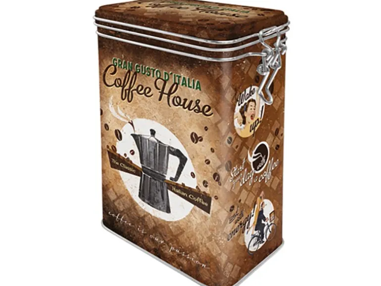 Ein Blickfang im Nostalgie-Design: Diese Vorratsdose Coffee House von Nostalgic-Art schafft Platz und Ordnung im Regal und sieht dabei auch noch besonders gut aus. Das hübsche Motiv kommt durch den matt schimmernden Druck toll zur Geltung. Die Dose ist aus stabilem und sauberem Blech gefertigt – und natürlich lebensmittelecht. Der hochwertige Stahlbügelverschluss verschließt die Dose schön fest. Zusätzlich sorgt eine Kunststoffdichtung im Inneren des Metall-Deckels dafür, dass Ihr Kaffee ebenso wie Tee und andere Lebensmittel schön aromatisch und frisch bleiben. Bestimmte Bereiche des Motivs sind hervorgehoben. Diese Motivprägung verleiht der Dose eine schöne Haptik und lässt sie zudem besonders edel wirken. Eine Dose, die (fast) täglich in Gebrauch ist, sollte hochwertig verarbeitet sein, gut aussehen und eine angenehme Griffigkeit haben. Diese Dose ist daher hochwertig bedruckt, sieht dank der Mattlack-Veredelung und den geprägten Bereichen wirklich toll aus und ist bewusst klein gehalten. Ein Pfund Kaffee kann sie wunderbar aufbewahren.