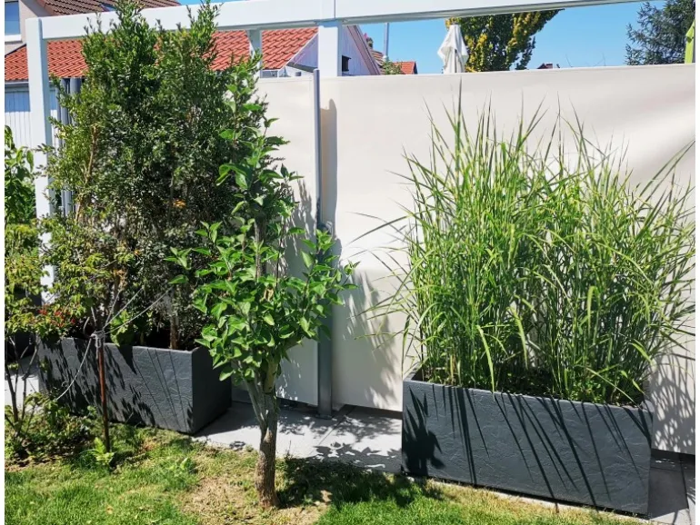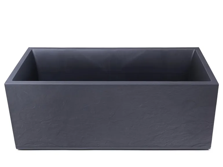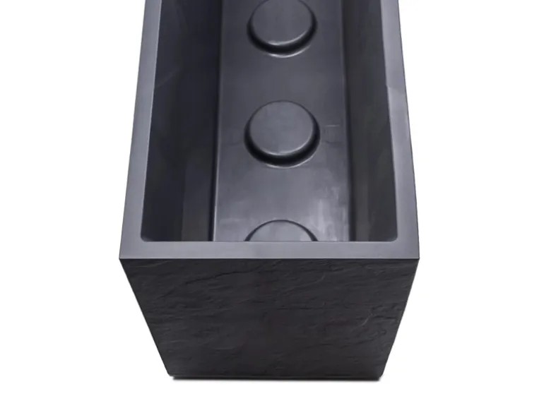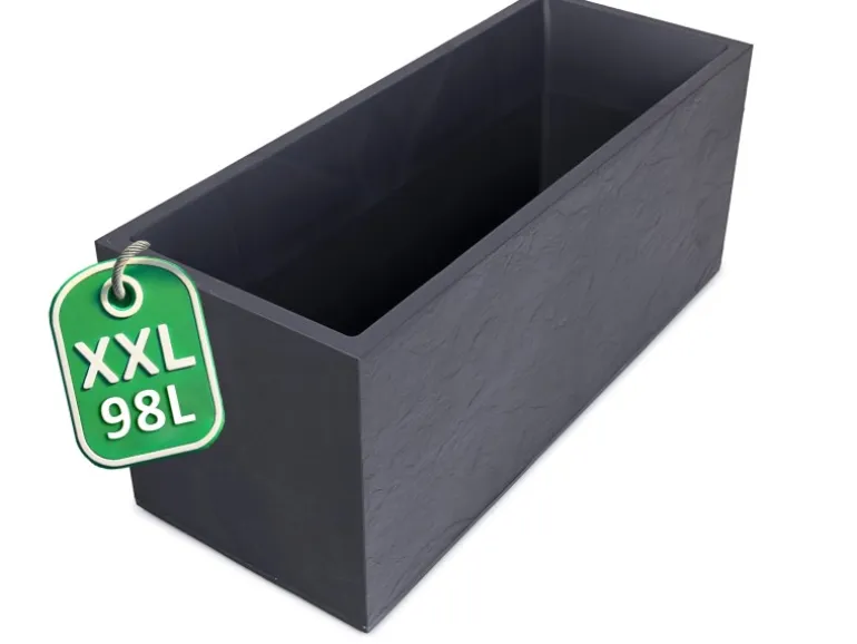 Der Pflanzkübel Vulkan 100 ist aus hochwertigem Kunststoff und wirklich ein besonders schöner Blumenkübel, der mit seinem klassischen Vulkan-Gestein-Design und seinen klaren Linien besticht. So passt er in jedes Ambiente. Er eignet sich hervorragend für moderne Arrangements, aber auch im Zusammenspiel mit anderen Stilen macht er eine gute Figur. Der Pflanzkübel Vulkan 100 hat ca. 98 Liter Pflanzvolumen und lässt sich besonders schön mit den verschiedensten Blumen bepflanzen, aber auch reduzierte Pflanzenarrangements wirken wundervoll in diesem Blumenkübel. Der Pflanzkübel Vulkan 100 wirkt schön auf der Terrasse oder dem Balkon und auch an einer exponierten Stelle im Garten verbreitet er seinen klassischen Charme. So lässt sich mit wenig Aufwand modernes Design in verschiedenste Arrangements einfügen. Durch die Größe von ca. 100 x 40 x 43 cm und seine ca. 98 Liter Pflanzvolumen ist der Pflanzkübel Vulkan 100 ideal geeignet für die verschiedensten Blumenzusammenstellungen. So haben Sie genügend Platz, um Ihre eigenen Vorstellungen zu verwirklichen und verschiedenste Arrangements auszuprobieren. Gleichzeitig ist der Pflanzkübel Vulkan 100 auch nicht zu groß. Der Pflanztopf besteht aus Kunststoff. Das bedeutet nicht nur, dass der Kübel mit ca. 8 kg Eigengewicht sehr leicht für seine Größe ist. Der Kunststoff ist auch UV-resistent und trotzt jedem Wetter. Für eine bessere Wärme- und Kälteisolierung wurde der Vulkan-Kübel doppelwändig gebaut. Außerdem besitzt er einen Wasserspeicher im Boden.
