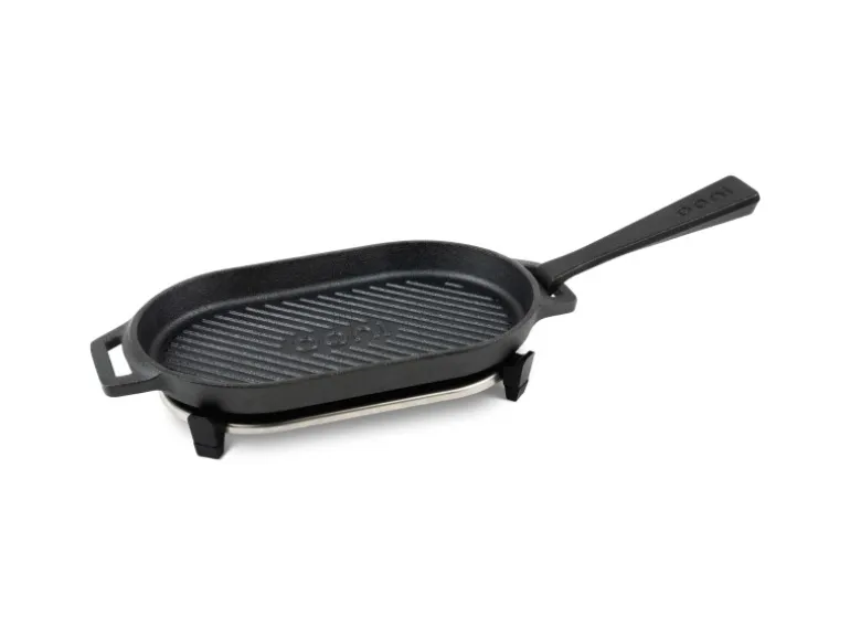 Mit der Ooni Grillpfanne können Sie Fleisch, Fisch, Hähnchen, Gemüse und vieles mehr direkt in Ihrem Ooni Ofen auf dem Feuer zubereiten. Diese hochwertige Pfanne kombiniert die Vielseitigkeit unserer gusseisernen Produkte mit den unverwechselbaren, Instagram-würdigen Grillspuren, die Sie nur mit einer Grillpfanne erzielen können. Die Grillpfanne wird mit einem speziell entworfenen, abnehmbaren Gusseisengriff geliefert, mit dem Sie die Pfanne sicher in den Ofen stellen können. Stellen Sie die Grillpfanne auf den Untersetzer aus Edelstahl, um Ihren Tisch zu schützen, und servieren Sie sie kochend heiß aus dem Ofen.