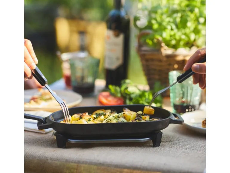 Der abnehmbare, einhakbare Gusseisengriff bleibt kühl, während das Essen gart