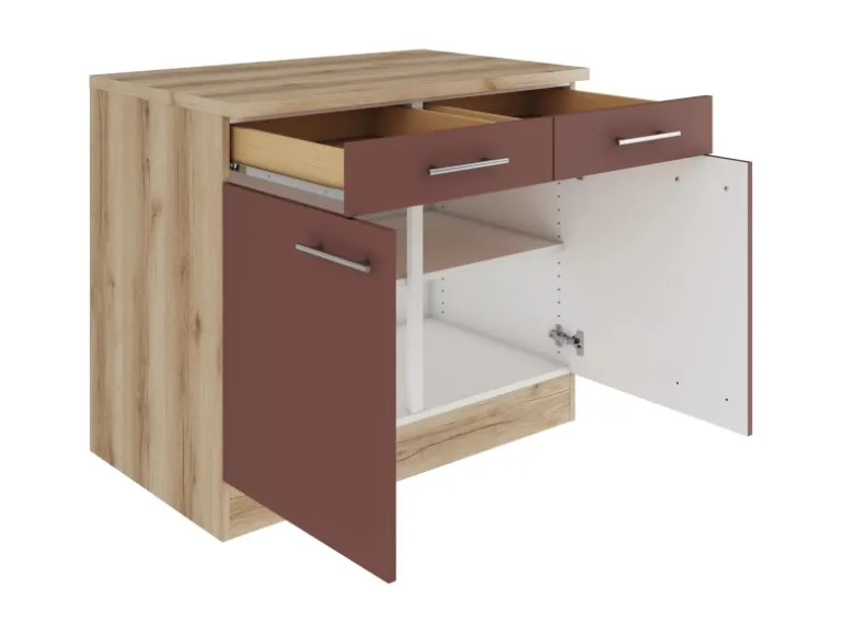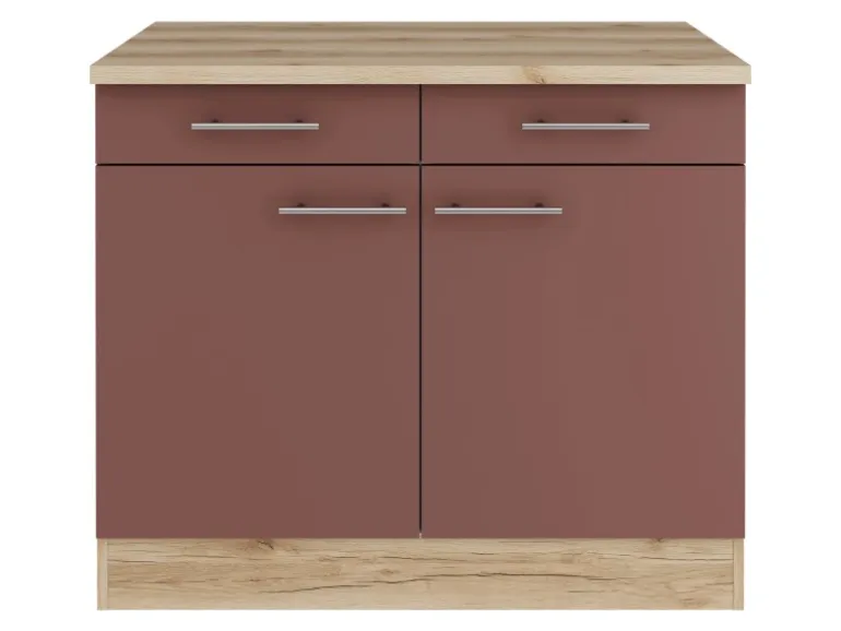 Die Serie Bari407 ist mit der Kombination aus Frontfarbe in Rostrot mit Korpus und Arbeitsplatte in Wildeiche Nachbildung perfekt abgestimmt. Metallgriffe in Edelstahl-Optik runden den Look ab und machen Ihre Küche zu einem echten Hingucker.